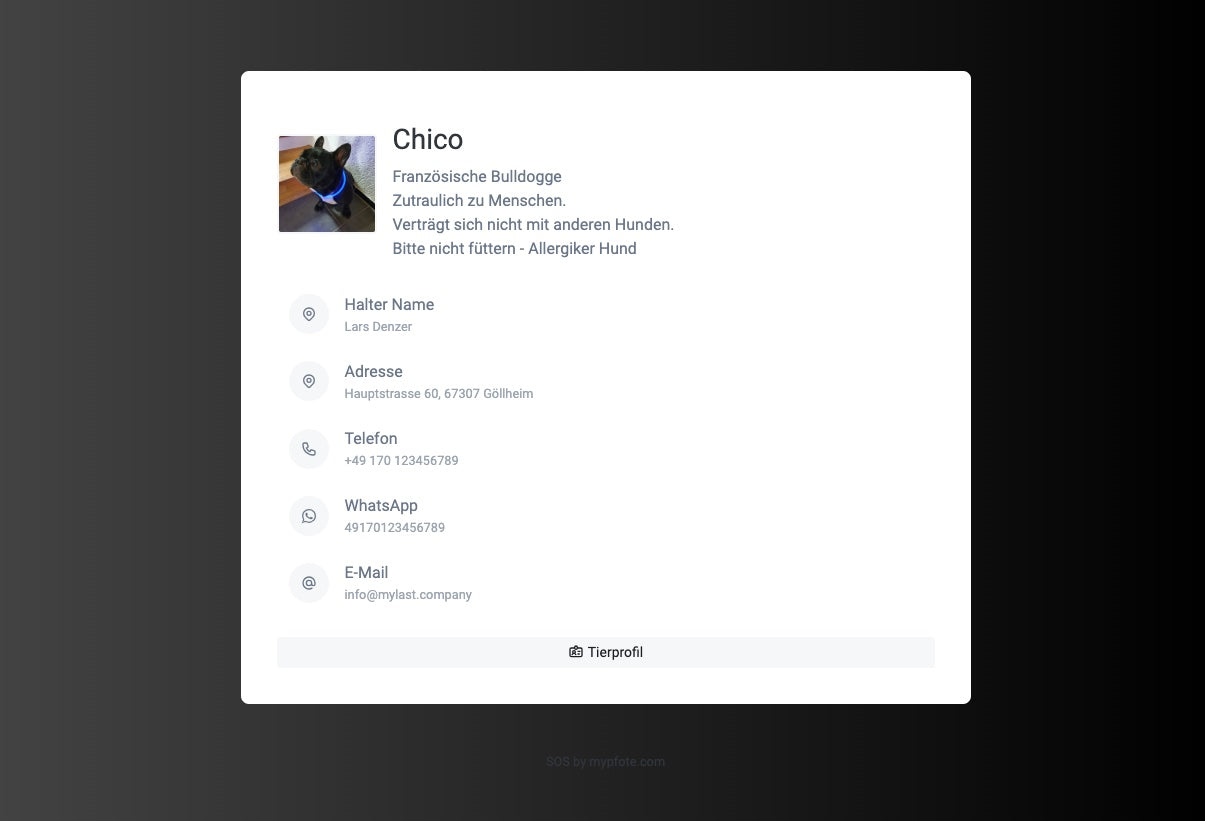 På den här bilden kan du se ett exempel på profilen för vår kära Chico. Din SOS-profilsida kan hyras för bara 1 euro per månad eller 12 euro per år. URL:en eller QR-koden kan naturligtvis också användas för andra ändamål.