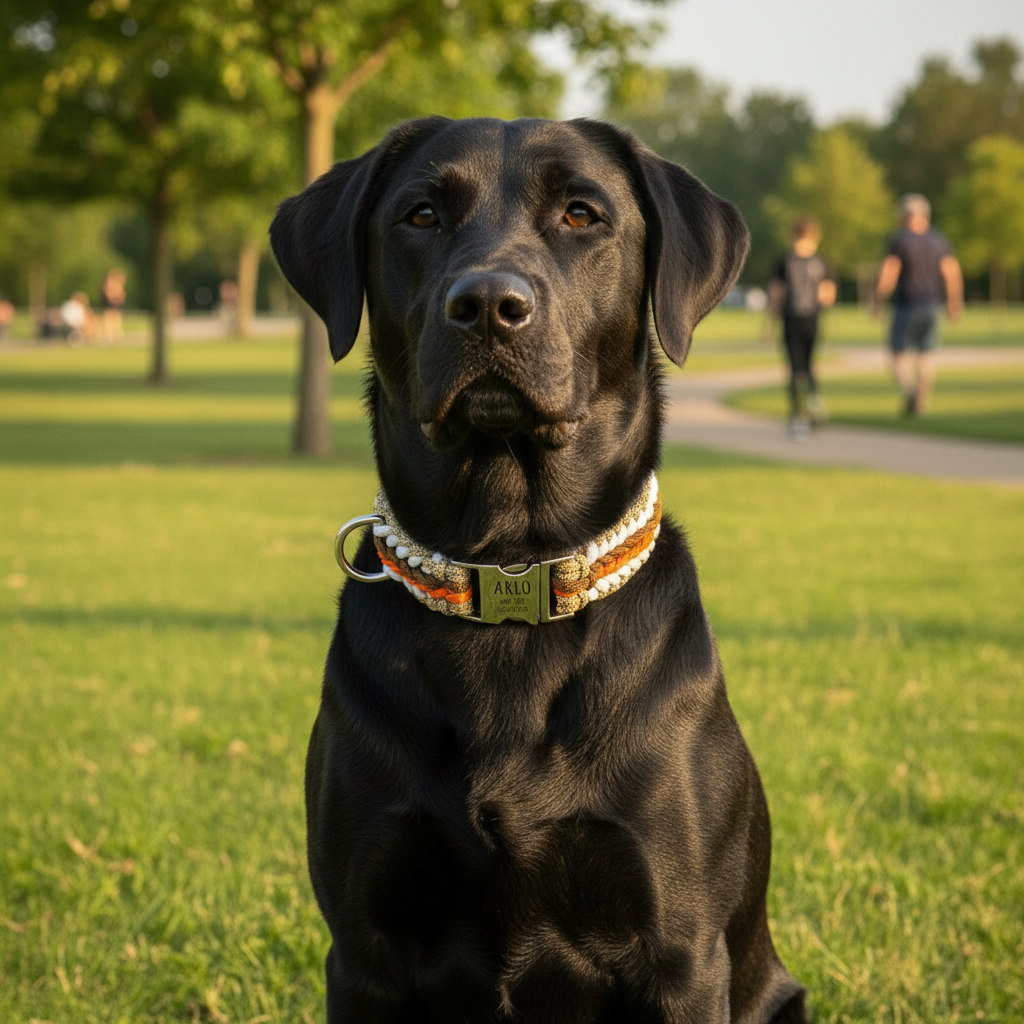 Arlo - Handgjort hundhalsband i paracord med gravyr | Orange-Brun-Vit-Beige